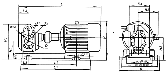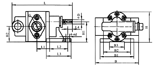 | 型號(hào) | L | L1 | L2 | L3 | L4 | B | B1 | B2 | B3 | H | H1 | H2 | φD | G | 4-φd |