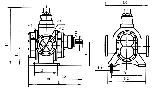 | 型號(hào) | L | L1 | L2 | B1 | B2 | B3 | H | H1 | H2 | φ1 | φ2 | φ3 | n-d | φD | 4-φd |
